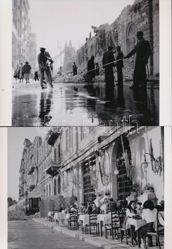 1948 Budapest, a Bristol Hotel romjainak eltakarítása során keletkező por csillapítása, a háttérben az Erzsébet híd maradványa; közvetlen közelében utcai teraszozás; Robert Capa (1913-1954) (eredeti neve Friedmann Endre) magyar - francia fotóriporter felvételei, aki 1948-ban hazalátogatott, 2 db modern nagyítás, jelzés nélkül, a néhai FOTÓ újság (1954-1989) archívumából, 15x21 cm