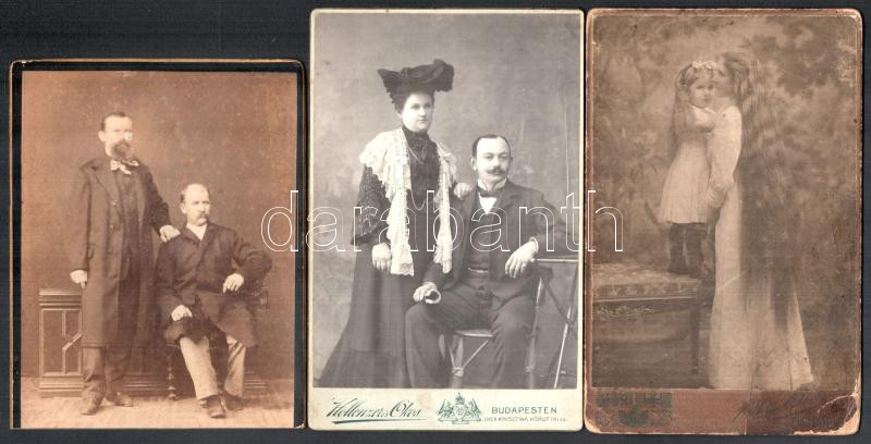 cca 1890-1910 Vegyes portrék (hosszú hajú lány, házaspár, úriemberek), 3 db keményhátú fotó, klf. műtermekből, változó állapotban (részben sérült), 16x10,5 cm körül