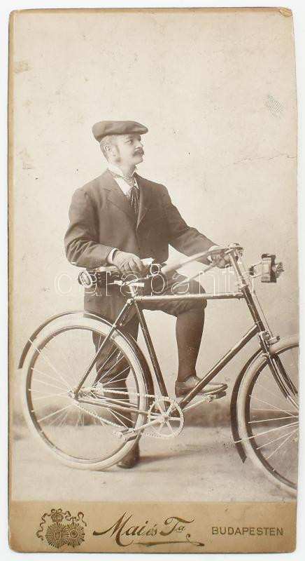 cca 1910, Mai és Társa Budapest keményhátú fotó biciklistáról, némi ko... https://www.darabanth.com/de/478-Fernauktion/478.0/Fotografie/Foto~2000026/cca-1910-Mai-es-Tarsa-Budapest-kemenyhatu-foto-biciklistarol-nemi-kopottsaggal-20-5x11-cm~II3261029