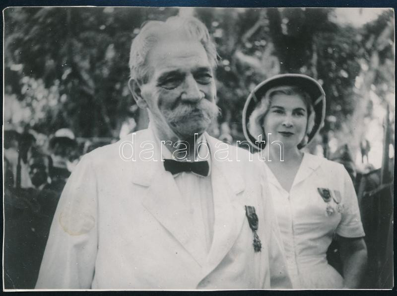 cca 1961-65 Albert Schweitzer (1875-1965) német filozófus, teológus egy beazonosítandó hölgy társaságában, mindketten kitüntetéssel dekoráltak, jelzés nélküli fotó, törésnyomokkal, 11×15,5 cm