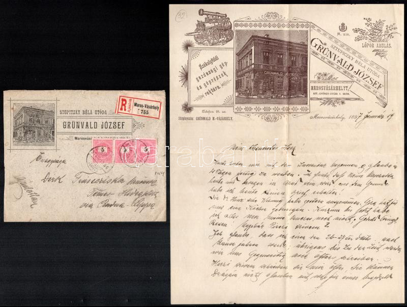 1897 Marosvásárhely, Grünwald József székelyföldi gazdasági gép- és géprészek raktára fejléces levélpapírjára írt levél, rajta az üzlet képével, fejléces borítékkal