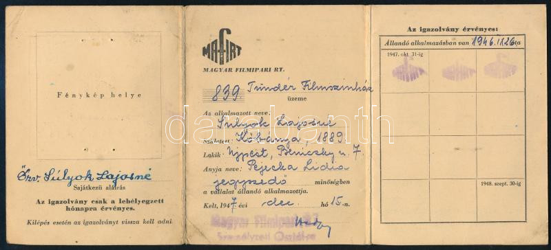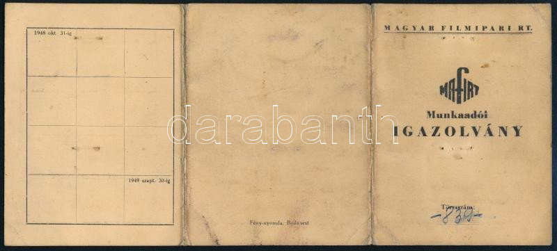 1947 Magyar Filmipar igazolvány jegyszedő részére https://www.darabanth.com/de/478-Fernauktion/478.0/Kunst-Dokumente-andere-Sammelgebiete/Dokument~500020/1947-Magyar-Filmipar-igazolvany-jegyszedo-reszere~II3259693