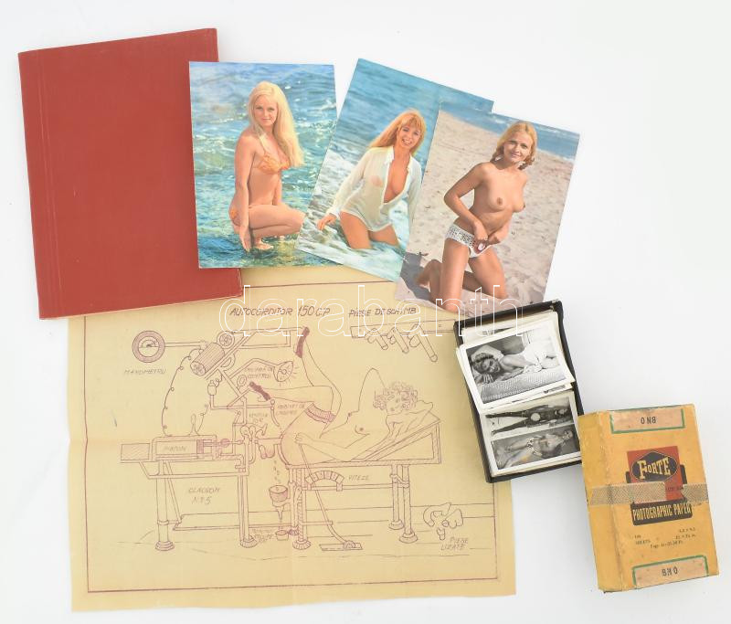Beschreibung: Erotikus, pornográf gyűjtemény: fotók (kb. 110 db kisméretű fotó, Forte dobozban), képeslapok (3 db), "Kefélőgép" grafika, Viola pornográf magazin
