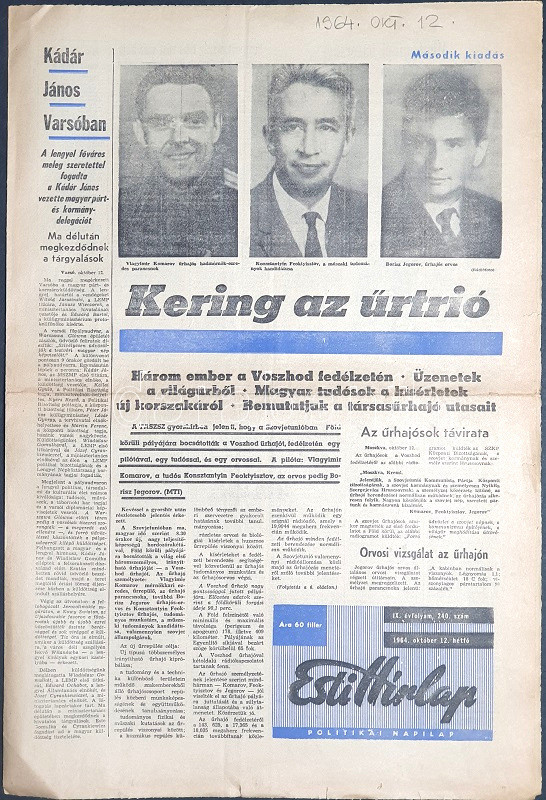 [Folyóirat] ,,Kering az űrtrió. Három ember a Voszhod fedélzetén. Üzenetek a világűrből" Az Esti Hírlap politikai napilap lapszáma a Voszhod-1 űrhajó, az első szovjet többszemélyes űrhajó útjáról, a hetedik szovjet űrrepülésről. (IX. évfolyam, 240. szám, 1964. október 12.) Budapest, 1964. Szikra Lapnyomda. [4] p. Folio. A második világháborút követően jelentős fegyverkezési verseny kezdődött az Egyesült Államok és a Szovjetunió között. Ennek a versengésnek az eredménye a nyugati világot sokkoló Szputnyik-1 műhold fellövése 1957 októberében, melyet a szovjet hírközlés nagy diadallal jelentett be. Újabb diadalnak számított szovjet oldalon - és a nyugati szorongás újabb epizódját szolgáltatta - az első űrrepülések sora, melyeket szovjet űrhajósok hajtottak végre: a Vosztok-1 űrhajó fedélzetén Jurij Gagarin 1961. április 12-én tett meg egy teljes fordulatot a Föld körül, majd 1961 augusztusában German Tyitov őrnagy is útnak indult a Vosztok-2 űrhajón, 17 teljes Föld-fordulatot megtéve. A harmadik (és negyedik) űrrepülésre még merészebb tervet tűzött ki a szovjet vezetés: több napon át tartó keringést, mégpedig két szovjet űrhajó, a Vosztok-3 és Vosztok-4 együttes részvételével. Az 1962 augusztusában lezajlott űrrepülés 4, illetve 3 napig tartott, rádióüzenetek és egy igen rövid televíziós közvetítés is érkezett a földi irányítóközpontba. 1963 júniusában a Vosztok-5 és a Vosztok-6 tartott több napos közös repülést. Bár a szovjet űrhajózás az addigi hat úttal számos tájékozódási, vezérlési, kommunikációs és egészségügyi kérdésre választ kapott, továbbra is megoldatlan maradt a többszemélyes űrutazás kérdése. Minthogy az amerikai űrprogram erősen beharangozta, hogy jövendőbeli Gemini-programjában többszemélyes űrutazást tervez, az amerikai elsőséget megakadályozandó Hruscsov első titkár parancsba adta, hogy még 1964 folyamán szovjet színekben végre kell hajtani az első többszemélyes űrutazást. A konstruktőröknek nem maradt ideje egy teljesen új űrhajó létrehozására, így a Vosztok-modellek áttervezése mellett döntöttek, és nem is két, hanem három embert, köztük két civilt kívántak feljuttatni az űrbe. Az űrhajó rendkívül szűk helynek bizonyult a három fős legénység számára, biztonsági megfontolásokat elvetve pedig - először az űrutazások történetében - szkafandert sem viseltek az űrhajósok és későbbi visszaemlékezések szerint az étkezés és az űrpelenka használata is komoly nehézségekbe ütközött az utazás során. Mind e nehézségekről azonban semmit nem említ az egykori diadalittas beszámoló, az Esti Hírlap délutáni napilap azon száma, amely az űrutazás megkezdésének napján jelent meg. A Voszhod-1 űrhajó 1964. október 12-én indult egynapos útjára, fedélzetén Vlagyimir Komarov parancsnokkal, Konsztantyin Feoktyiszov mérnökkel és Borisz Jegorov orvossal. Lapszámunk beszámol az első űrbeli, szakszerű orvosi vizsgálat megtörténtéről, portrét ad a három űrhajósról, közli nyilatkozataik hivatalos, a szovjet hírügynökség által jóváhagyott verzióját, és azzal a feltételezéssel él, hogy a Voszhod-1 akár 10-12 napig is keringhet az űrben. A valóság lapunk állításaira rácáfolt, a fölöttébb kényelmetlen utazás már másnap - feltehetően résztvevőik több értelmű megkönnyebbülésére - összesen 1 nap 17 perc keringés után véget ért; az űrutazás során az űrhajó 16 alkalommal kerülte meg a Földet. Jó állapotú lapszám.