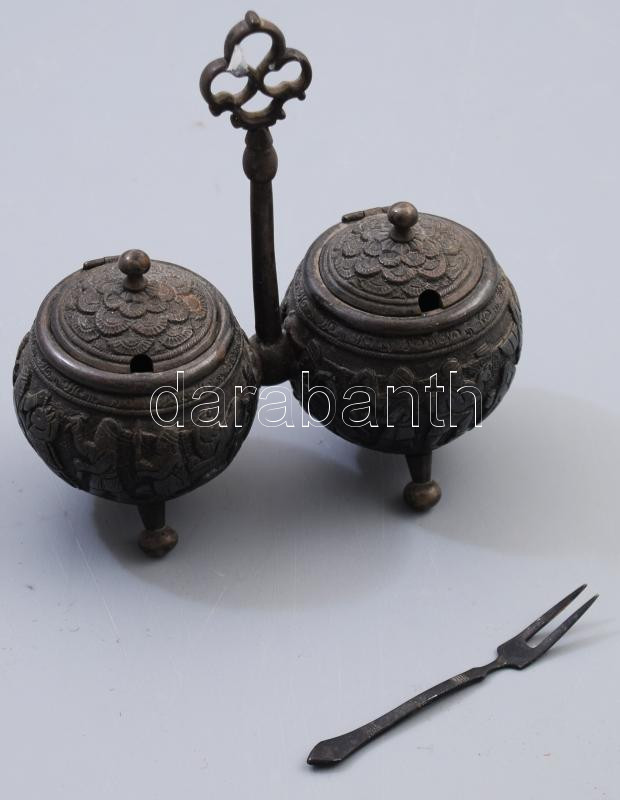 Beschreibung: Asztali só és borstartó, egy kis kanállal. Spiáter 12 cm