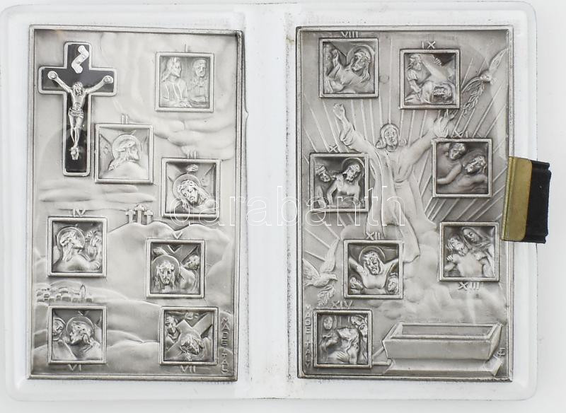 Beschreibung: Olasz kegytárgy, kétrészes dombornyomott fémlemez a 14 stációval és feszülettel, tokban
