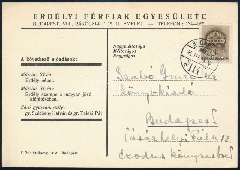 1942 Erdélyi Férfiak Egyesülete meghÃvója a Gróf Teleki Pál Erdélyi Em... https://www.darabanth.com/de/478-Fernauktion/478.0/Kunst-Dokumente-andere-Sammelgebiete/Historische-Dokumenten-Handschriften~500021/1942-Erdelyi-Ferfiak-Egyesulete-meghivoja-a-Grof-Teleki-Pal-Erdelyi-Emlekeloadassorozat~II3261854