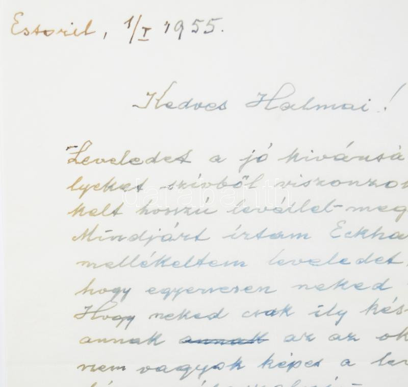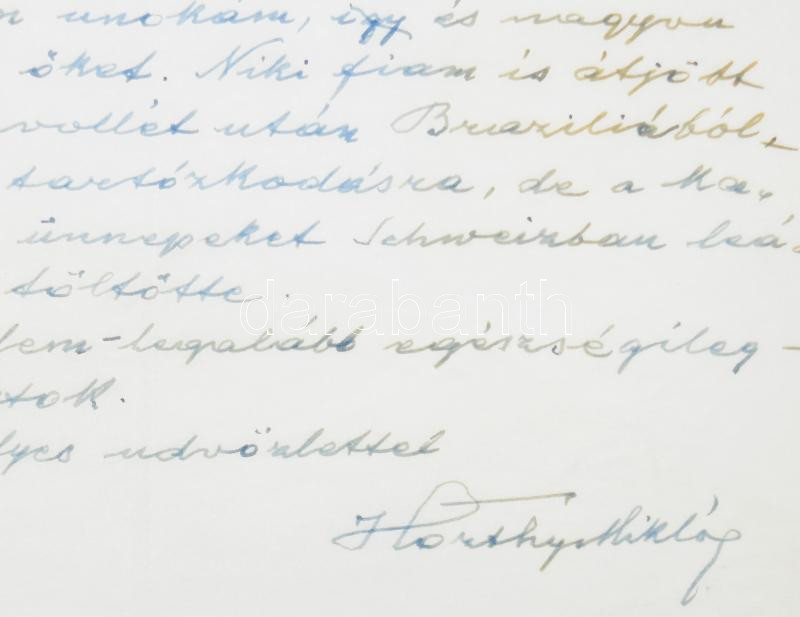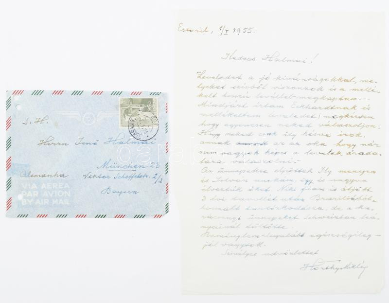 1955 Estoril, 1955. I. 1., vitéz nagybányai Horthy Miklós (1868-1957) saját kézzel írt levele, aláírásával, Halmai Jenőnek Münchenbe. "...Mindjárt írtam Eckhardtnak és mellékeltem leveledet, megkértem, hogy egyenesen neked válaszoljon.... Az ünnepekre eljöttek Illy mennyem és István unokom és nagyon élveztük őket. Niki fiam is átjött 3 évi távollét után Brazíliából hosszabb tartózkodásra, de karácsonyi ünnepeket Schweizban leányainál töltötte... " Eredeti borítékkal, hajtott, jó állapotban.