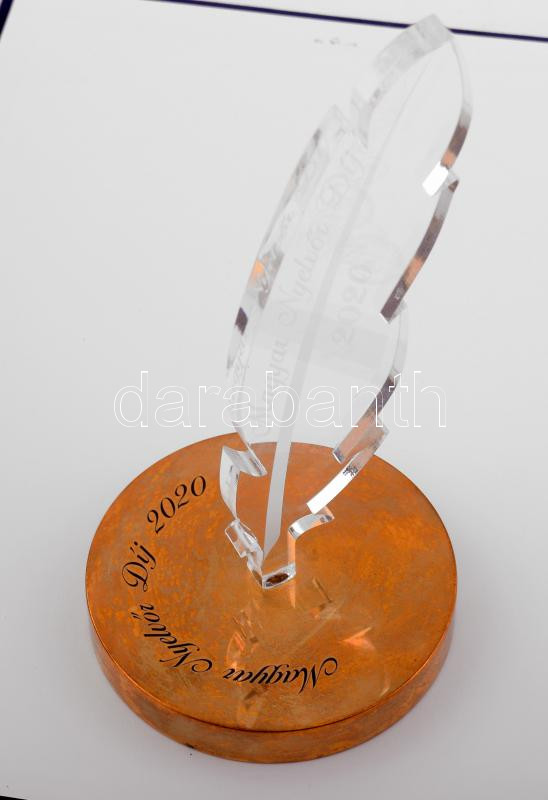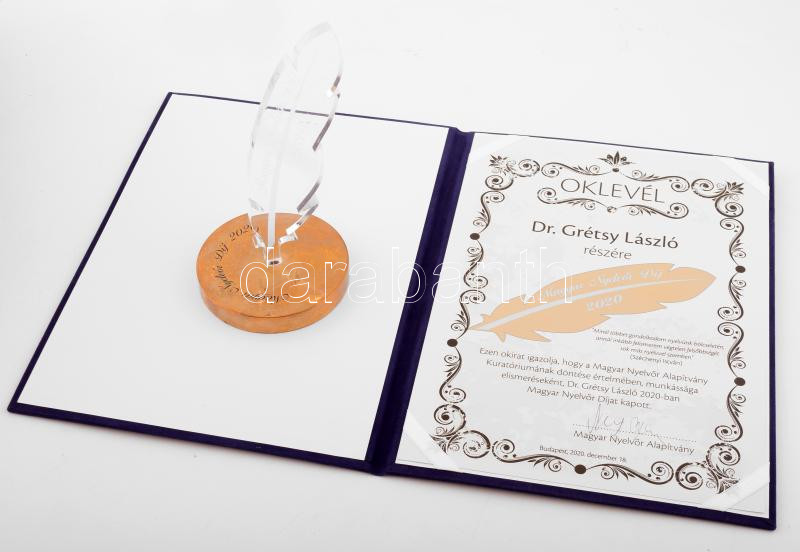 2020, Dr. Grétsy László nyelvész által elnyert Magyar Nyelvőr Díj. Plexi, bronz talpazatban, adományozási dokumentummal.