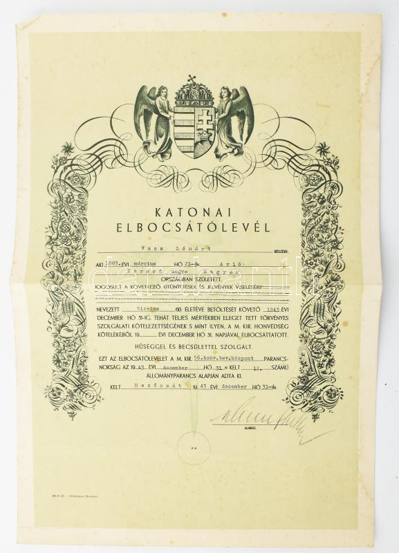 1943 Katonai elbocsátólevél Mezőcsát, "m. kir. 56. honv. bev. központ"... https://www.darabanth.com/de/478-Fernauktion/478.0/Kunst-Dokumente-andere-Sammelgebiete/Militaria~290/1943-Katonai-elbocsatolevel-Mezocsat-m-kir-56-honv-bev-kozpont-30x44-cm-Hajtva~II3110852