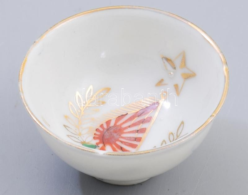 Japán porcelán katonai szakés csésze. cca 1940-1944, 4. lovas hadiszállítmányozási egység, zászló, koszorú és csillag díszítéssel, alsó oldalán lovas mintával, egy lepattanással, d: 5,5 cm
