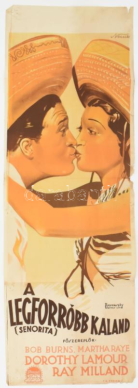 cca 1938-1940 A legforróbb kaland (Senorita). Moziplakát (filmplakát, rácsplakát). Bob Burns, Dorothy Lamour, Ray Milland, Martha Raye és mások szereplésével. Litográfia, papír. Radó Jenő és Gyula Nyomda. Kisebb lapszéli sérülésekkel, foltokkal. Hajtásnyomokkal. 95x31,5 cm. / Vintage rare Hungarian movie poster of the Hollywood movie "Tropic Holiday" (1938) starring Bob Burns, Dorothy Lamour, Ray Milland, Martha Raye, lithograph on paper, minor stains and damages on the edges