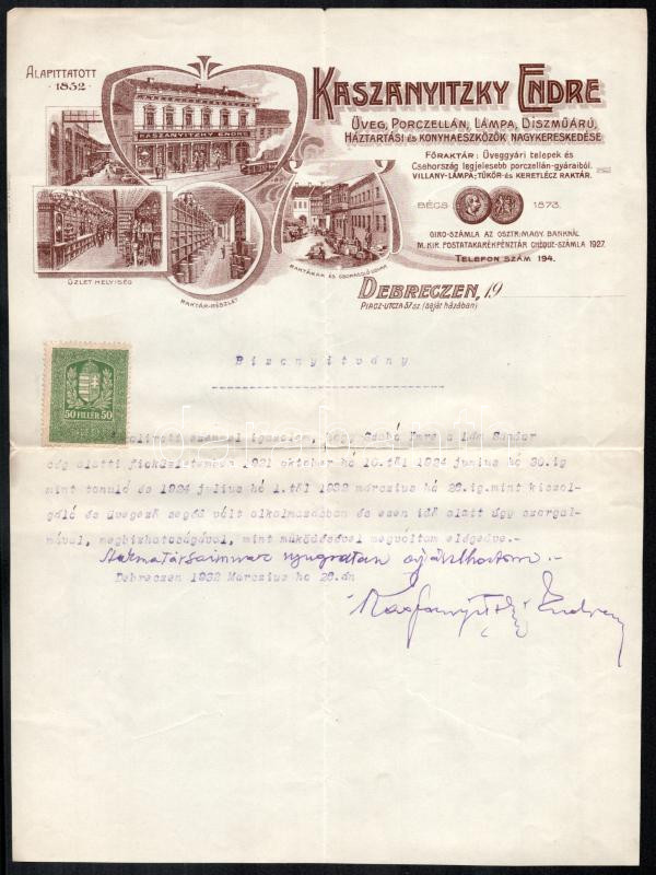 1932 Debrecen, Kaszanyitzky Endre Üveg, Porczellán, Lámpa, Díszműárú, Háztartási és Konyhaeszközök Nagykereskedésének fejléces papírja, rajta az üzlet képével, rajta munkáltatói igazolással, Szabó Imre (1904-1958) kereskedelmi tanuló, az Exodus Kiadó későbbi vezetője részére, hajtott.