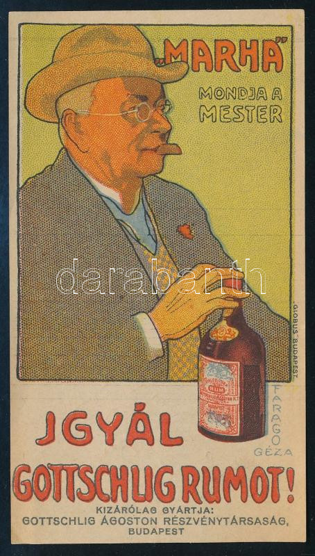 cca 1910 Faragó Géza (1877-1928): "Marha mond a mester igyál Gottschlig rumot?", reklámos litografált számoló cédula, Bp., Globus-ny., jelzett a dúcon, 12x7 cm