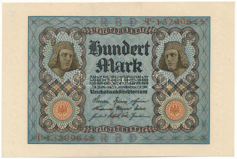 Német Birodalom / Weimari Köztársaság 1920. 100M nyolcjegyű sorszámmal T:AU German Empire / Weimar Republic 1920. 100 Mark with eight digit serial C:AU Krause P#69.b