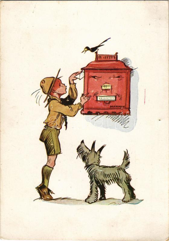 Cserkész művészlap postaládával és kutyával. Márton L.-féle Cserkészlevelezőlapok Kiadóhivatala kiadása / Hungarian boy scout art postcard with mailbox and dog s: Márton L. (lyuk / pinhole)