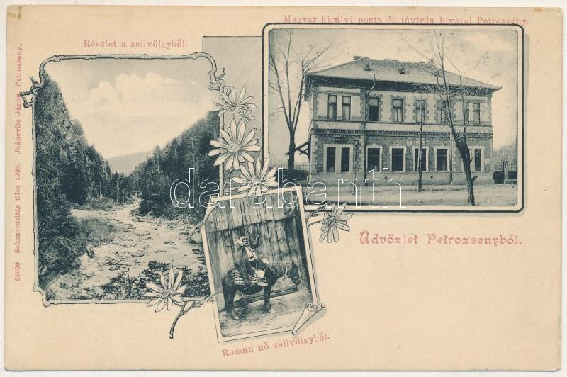 Petrozsény, Petroseni, Petrosani; Román nő a Zsil-völgyből, M. kir. posta és távirda hivatal. Joánovits János kiadása / valley, post and telegraph office, Romanian woman on horseback from Valea Jiului, Transylvanian folklore. Art Nouveau, floral (EK)