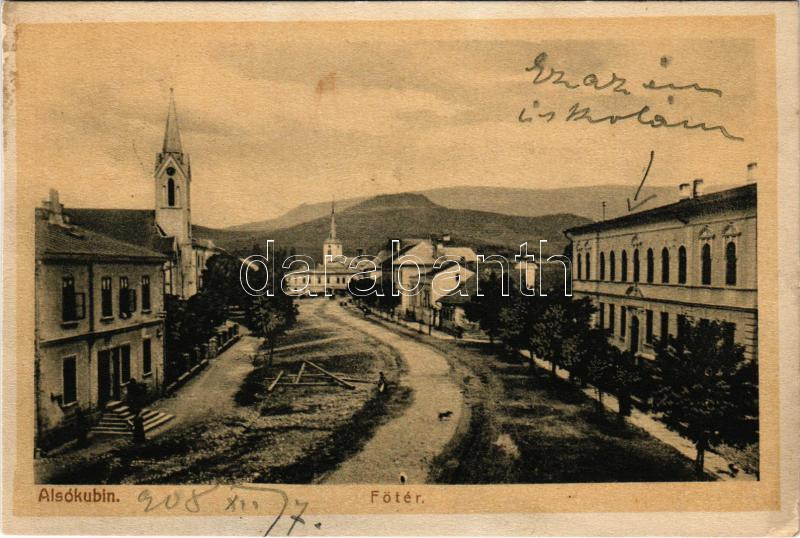 1908 Alsókubin, Dolny Kubín; Fő tér, templom, iskola / main square, ch... https://www.darabanth.com/de/479-Fernauktion/479.0/Ansichtskarten/Slowakei~2000007/1908-Alsokubin-Dolny-Kubin-Fo-ter-templom-iskola-main-square-church-school-vagott-cut~II3269260