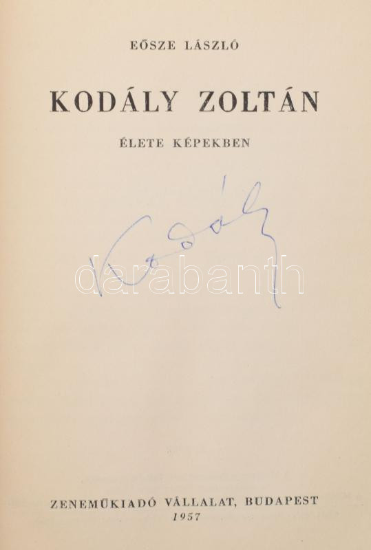 Eősze László: Kodály Zoltán élete képekben. A művész, Kodály Zoltán (1882-1967) zeneszerző által ALÁÍRT példány! Bp., 1957, Zeneműkiadó, 48 p.+26 t. Kiadói kartonált papírkötés, a gerincen kis sérüléssel, ajándékozási sorokkal, benne az aláíró személy, Kodály Zoltánra utaló résszel.