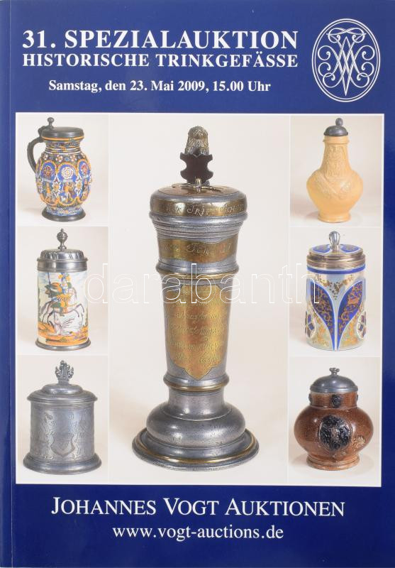 1990 Johannes Vogt Auktionen. 31. Spezialauktion Historische Trinkefässe. Johannes Vogt aukciós katalógus nagyrészt kerámia, de közte üveg és ón tárgyak is. Német nyelven. Rendkívül izgalmas és gazdag képanyaggal illusztrált.