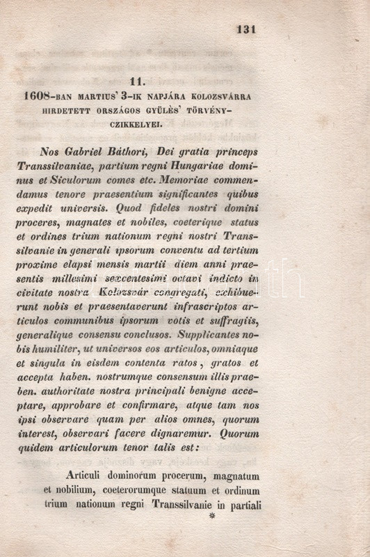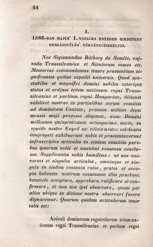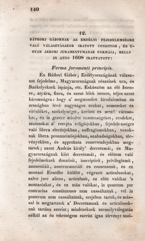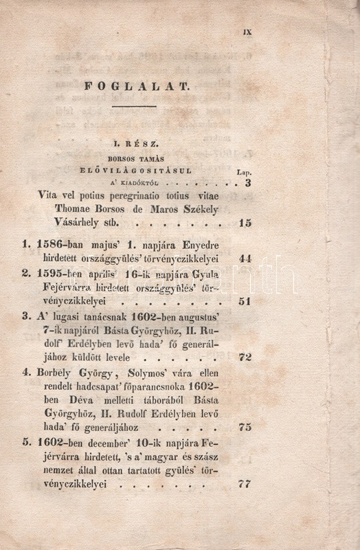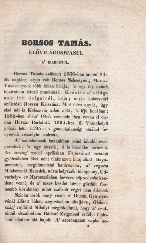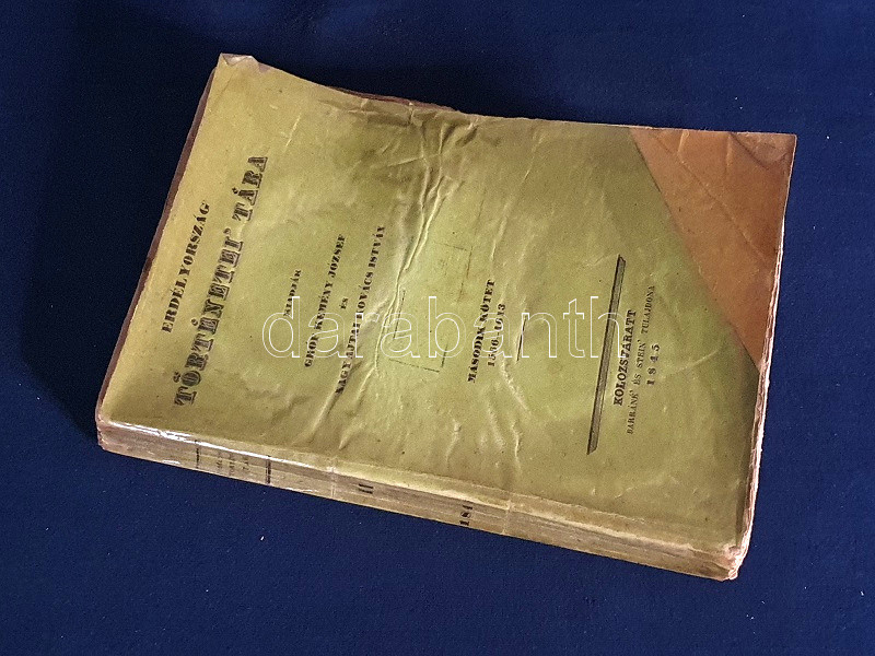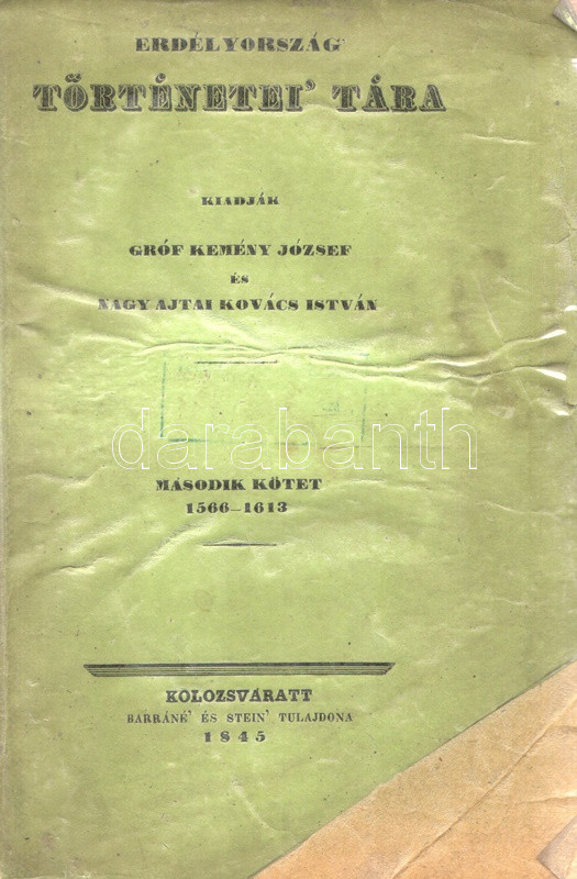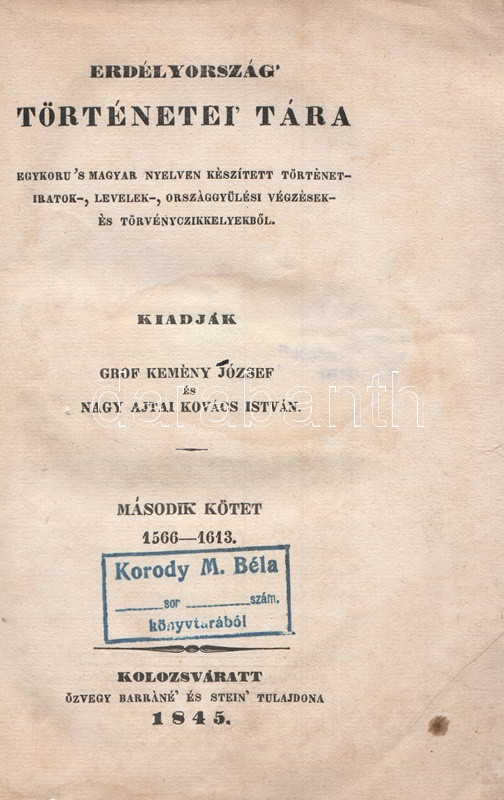 Erdélyország' történetei' tára. Egykoru 's magyar nyelven készÃtett történetiratok-, levelek-, országgyűlési végzések- és törvényczikkelyekbÅ‘l. Kiadják (szerkesztették) Kemény József és Nagy Ajtai Kovács István. Második kötet: 1566-1613. Kolozsváratt, 1845. Özvegy Barráné' és Stein' tulajdona (Nyomatott a' kir. Lyceum' betüivel). XIII + [3] + 291 + [1] p. A Kemény János (1795-1855) erdélyi történész a tudományos alapossággal végzett történeti dokumentum-kiadás jelentÅ‘s alakja. A Nagyajtai Kovács István történésszel együttműködésben kiadott forráskiadvány levéltári források, országgyűlési dokumentumok, tábori levelek alapján dolgozza ki Erdély XVI-XVII. századi történetét. A munka két kötetben jelent meg, az elsÅ‘ kötet az 1540-1600 közötti, a második az 1566-1613 közötti idÅ‘szak történetét adja közre, a két kötet esetén némileg eltérÅ‘ válogatási elvekkel. Ez utóbbi, önmagában is megálló könyv a Báthoriak korszakát idézi meg, Bethlen Gábor fejedelemségre kerüléséig, a nagy fejedelem számos korai rendelkezésével. Oldalszámozáson belül három levél kihajtható hivatalnoki táblázatokat közöl. Az elsÅ‘ nyomtatott oldalon egykori gyűjteményi bélyegzés nyomai, melyek közül az egyik megismétlÅ‘dik a cÃmoldalon. Az elsÅ‘ levélen erÅ‘sÃtés, egyes oldalakon halvány foxing. Poss.: Korody M. Béla könyvtára. Fűzve, javÃtott, sarkán pótolt, védÅ‘fóliába volt feliratozott kiadói borÃtóban. Körülvágatlan példány.