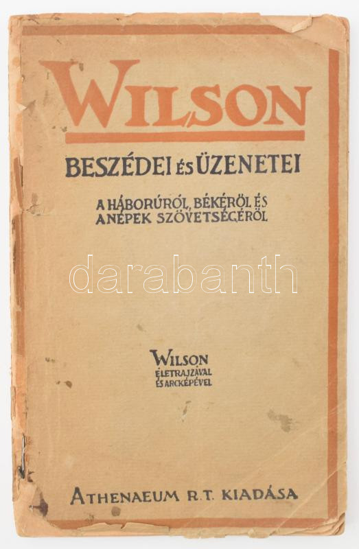 Wilson beszédei és üzenetei a háborúról, békéről és a népek szövetségéről. Összeáll.: Bródy Béla és Magyar Lajos. Bp., 1919, Athenaeum, 1 t +105+1 p. Kiadói papírkötés, sérült borítóval és címképpel, az elülső borító és a címkép levált sérült.