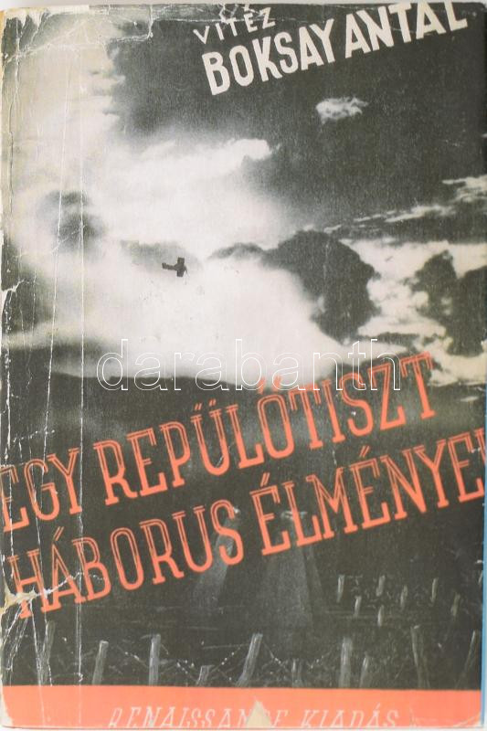 Boksay Antal: Egy repülőtiszt háborús élményei. Bp., 1938, Renaissance, 1 t. + 140+1 p.+ 8 t. Kiadói aranyozott egészvászon-kötés, modern, az eredetiről másolt papír védőborítóban.