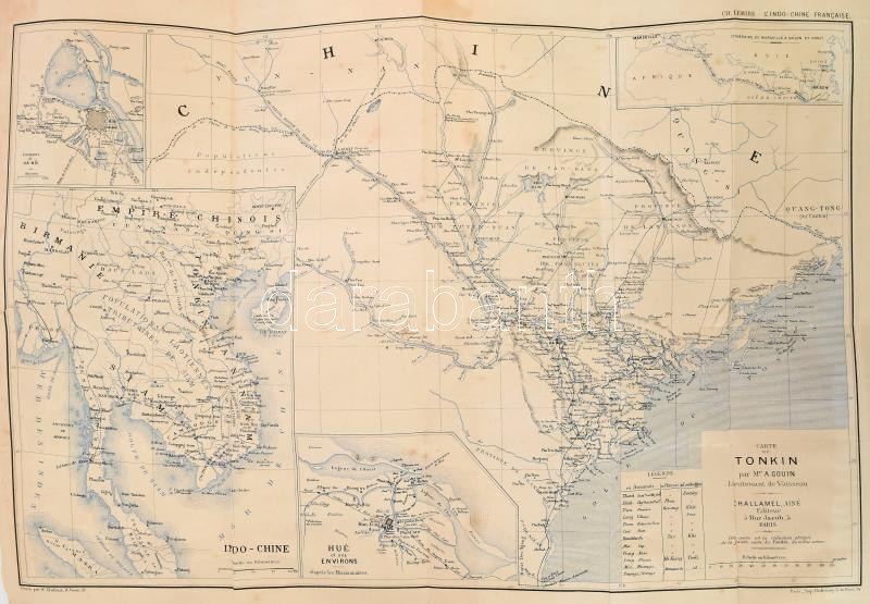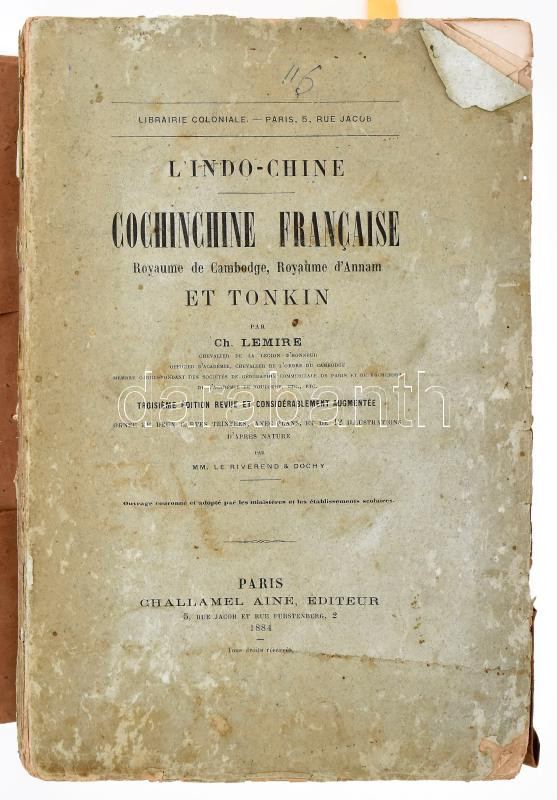 Charles Lemire: Cochinchine Francaise et Royaume de Cambodge, Royaume d'Annam et Tonkin. Paris, 1884, Challamel Ainé, 2+414+2+28+2 p.+VIII t. + 1 (kihajtható térkép) t. Francia nyelven. Kiadói papÃrkötés, foltos borÃtóval, szétvált kötéssel, foltos lapokkal, a borÃtó elején szamárfüllel, a térképen szakadással.