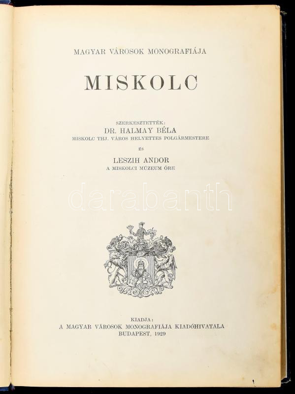 Miskolc. Szerk.: Dr. Halmay Béla és Leszih Andor. Magyar Városok Monográfiája V. Bp., 1929, Magyar Városok Monográfiája Kiadóhivatala (Wodianer F. és Fiai-ny.), VI+(2)+553+(1) p. Szövegközti fekete-fehér képekkel illusztrálva. Kiadói aranyozott, dombornyomott egészvászon-kötés, kissé sérült, kopott borítóval, javított gerinccel, helyenként kissé foltos lapokkal, intézményi bélyegzőkkel.