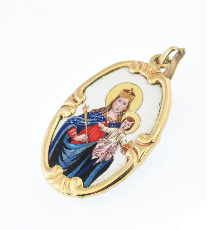 Arany (Au) 14K Szűz Mária ovális porcelán medál, jelzett, 3,4×1,8 cm, ... https://www.darabanth.com/de/479-Fernauktion/479.0/Juwellen-und-Kunstobjekte-aus-Edelmetall/Juwellen-und-Kunstobjekte-aus-Edelmetall~1000039/Arany-Au-14K-Szuz-Maria-ovalis-porcelan-medal-jelzett-3-4x1-8-cm-brutto-3-1-g~II3268850