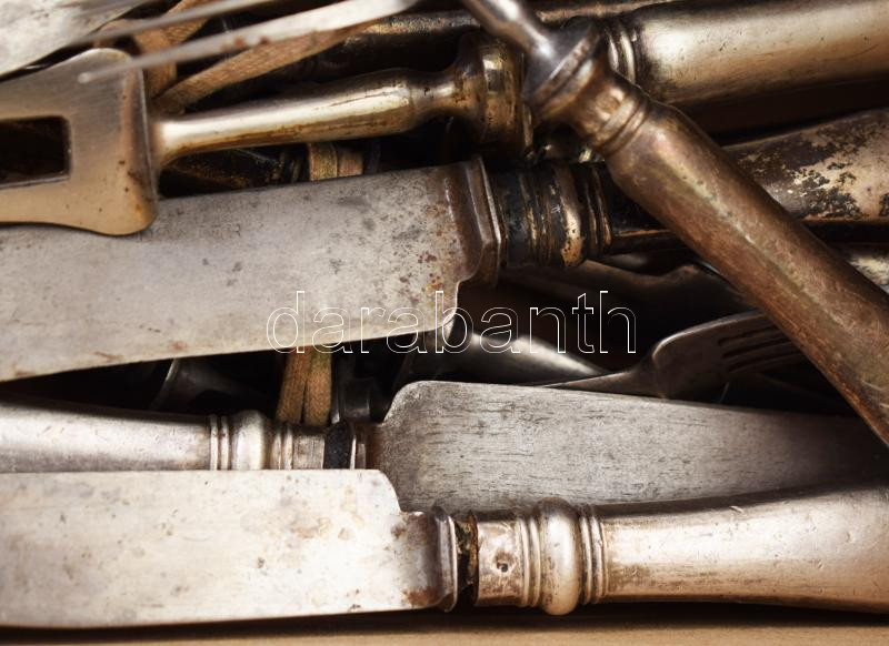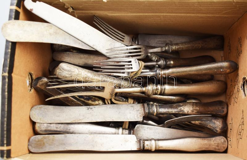 Beschreibung: Nagyrészt ezüst (Ag) nyelű evőeszközök, tálaló villák, stb. töltöttek. Kb 2/3 ezüst Érdemes átnézni össz 20 db