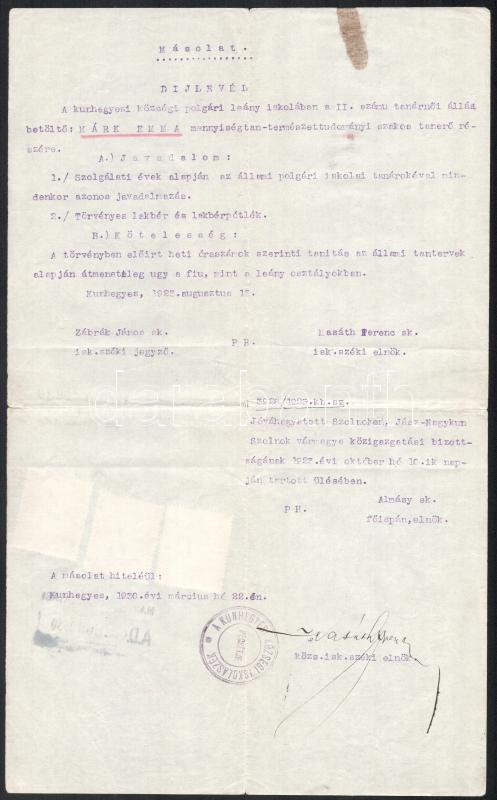 Beschreibung: 1923 Kunhegyes, másolat tanárnő számára kiadott díjlevélről