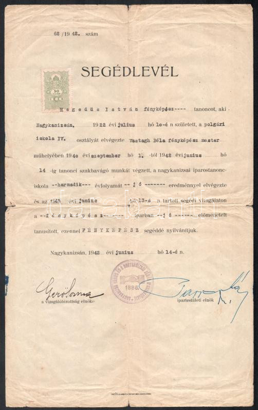 1942 Nagykanizsa, Hegedűs István fényképész segédlevele https://www.darabanth.com/de/479-Fernauktion/479.0/Kunst-Dokumente-andere-Sammelgebiete/Dokument~500023/1942-Nagykanizsa-Hegedus-Istvan-fenykepesz-segedlevele~II3270543