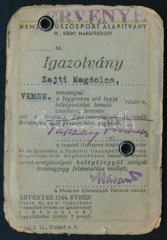 Beschreibung: 1944 A Nemzeti Sportuszoda fényképes tréningbelépője versenyző részére