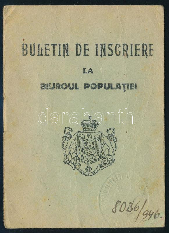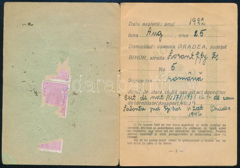 1946 Arad, román személyi igazolvány fénykép nélkül https://www.darabanth.com/de/479-Fernauktion/479.0/Kunst-Dokumente-andere-Sammelgebiete/Dokument~500023/1946-Arad-roman-szemelyi-igazolvany-fenykep-nelkul~II3266685