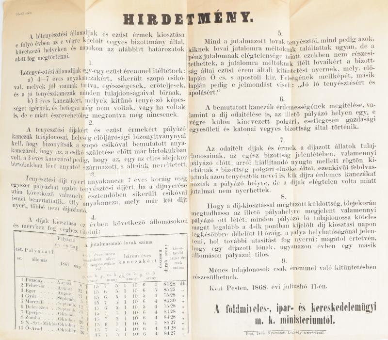 1868 Lótenyésztésért járó díjak és ezüst kiosztásáról szóló hirdetmény, magyar nyelven, jó állapotban, 38x44cm