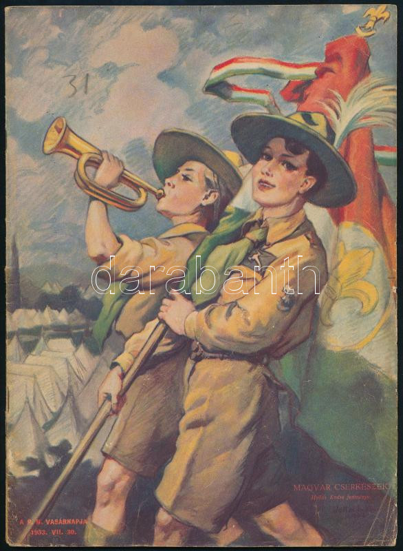 1933 A Pesti Hírlap Vasárnapja 1933. júl. 30-i száma (cserkész szám), benne gróf Teleki Pál a gödöllői jamboree-val kapcsolatos írásával és egyéb tematikus képekkel, írásokkal, kissé sérült címlappal, 52 p.
