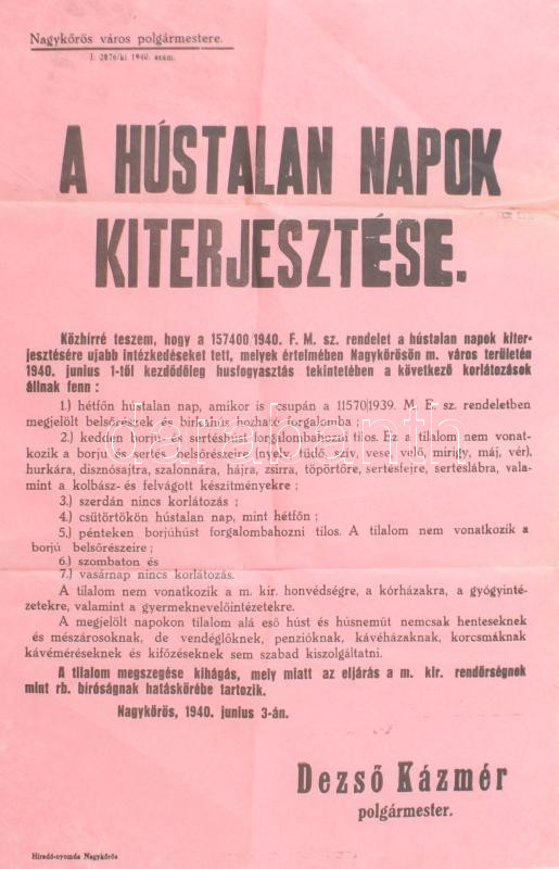 1940 Nagykőrös A hústalan napok kiterjesztése hirdetmény. 34x47 cm Haj... https://www.darabanth.com/de/479-Fernauktion/479.0/Kunst-Dokumente-andere-Sammelgebiete/Drucksachen~1000013/1940-Nagykoros-A-hustalan-napok-kiterjesztese-hirdetmeny-34x47-cm-Hajtva~II3272264