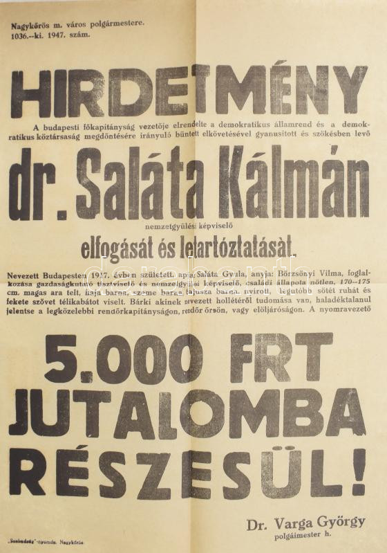 Beschreibung: 1947 Saláta Kálmán (1917?1958) kisgazda politikus államellenes bűncselekmény miatti elfogatóparancsának hirdetménye 29x44 cm