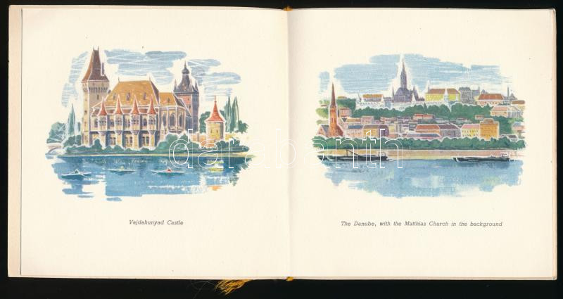 1960 Ferunion Budapest angol nyelvű karácsonyi-újévi üdvözlőlapja, leporellószerű, Budapest látványosságait ábrázoló színes illusztrációkkal (Opera, Országház, Hősök tere, stb.), jó állapotban, kihajtva: 67x13,5 cm