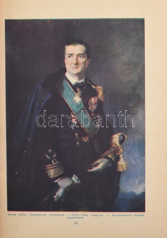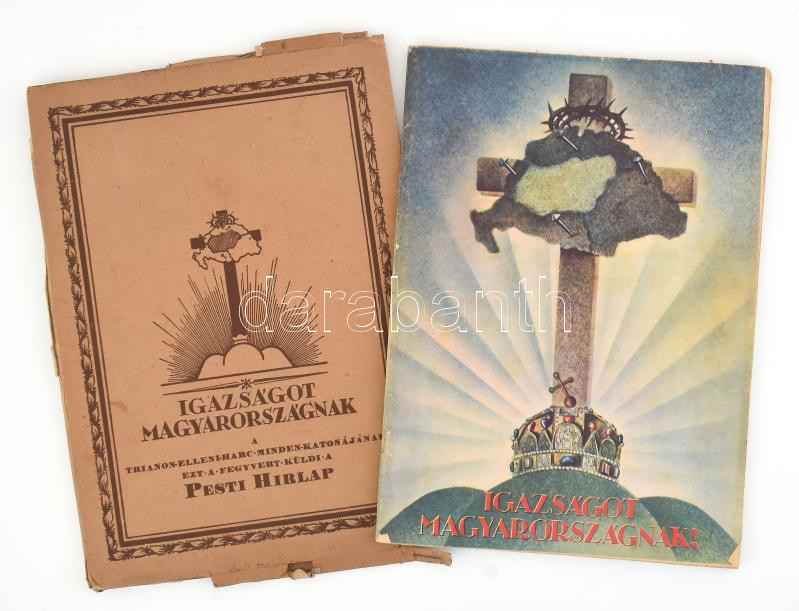cca 1930 Igazságot Magyarországnak! Trianon kegyetlen tévedései. A Pesti Hírlap ötvenéves fennállása alkalmából. Irredenta emlékkiadvány, fekete-fehér és színes képekkel, Dr. Légrády Ottó, a Pesti Hírlap főszerkesztője bevezető írásával. Kiadói tűzött papírkötés, (2)+150 p. Eredeti, sérült kiadói kartontokban.