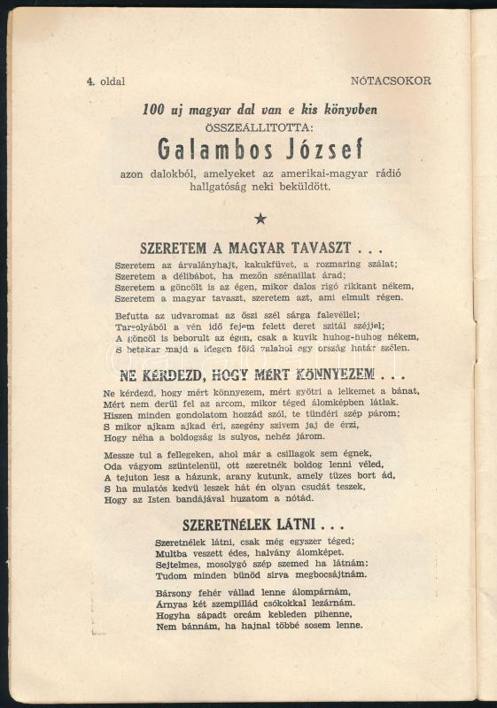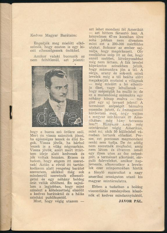 cca 1955 Jávor Pál amerikai turnéja végén kiadott füzet, benne Jávor Pál az amerikai magyar közönségtől búcsúzú soraival, valamint dalszövegekkel. Kiadó tűzött papírkötés, kissé sérült, foltos borítóval, 32 p.