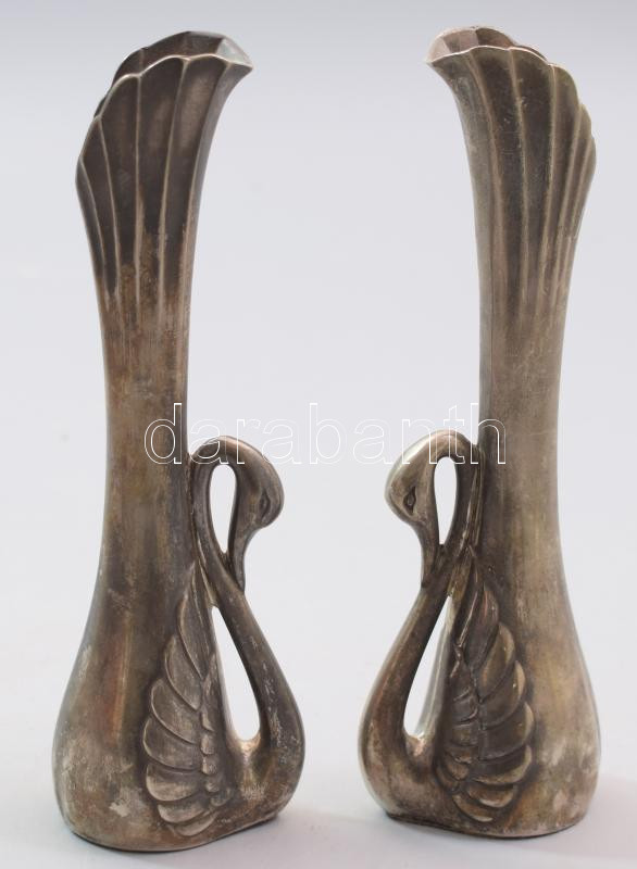2 db Hattyú figurális ezüstözött fém váza, kopással, jelzés nélkül, m: 18 cm
