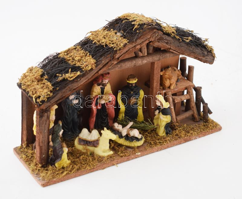 Beschreibung: Betlehem, műanyag figurákkal, fa. 30x24 cm