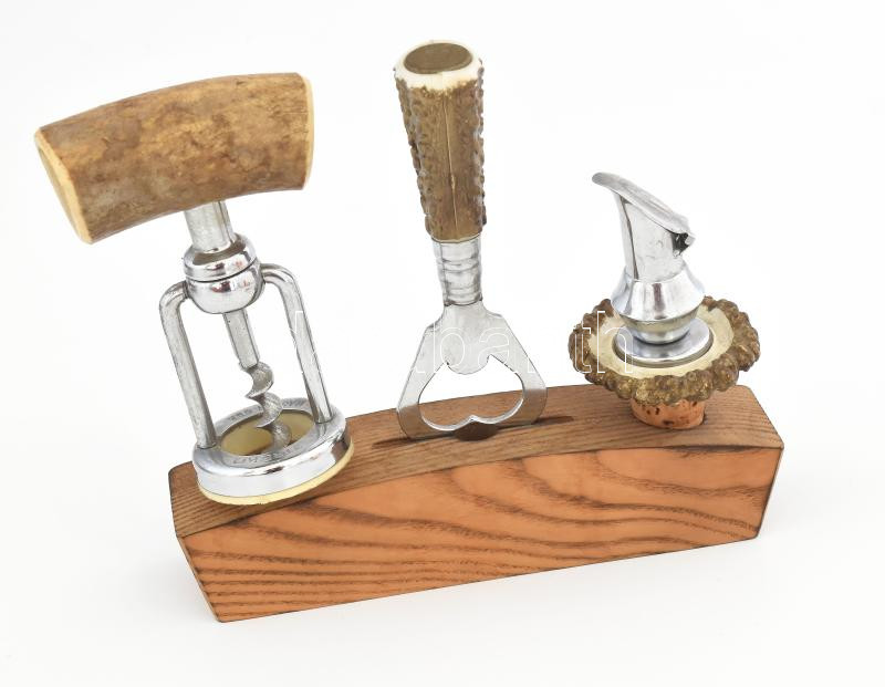 Beschreibung: Hátromrészes agancs rárakásos italszervírozó szett, fa tartóban.