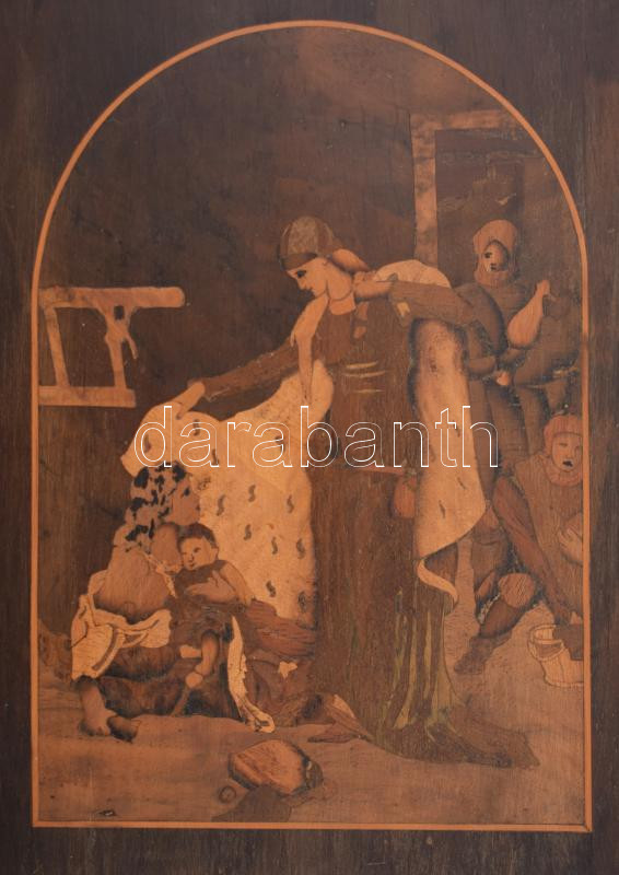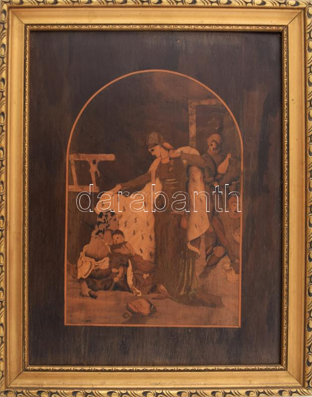 Beschreibung: Leizen-Mayer Sándor: Árpád-házi Szent Erzsébet című festményének fa intarzia másolata, részletes kidolgozottsággal keretben, 48x31 cm
