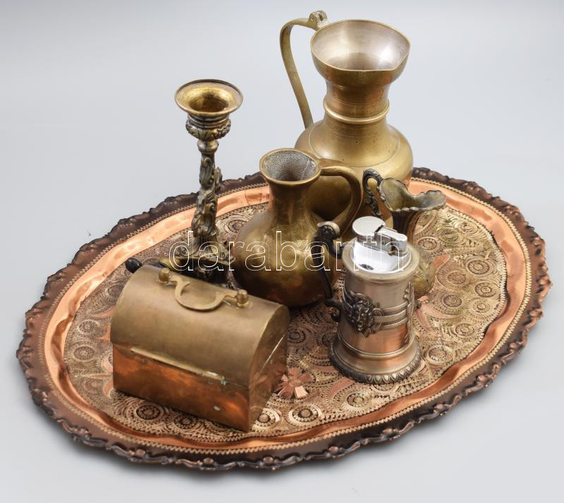 Beschreibung: Vegyes réz tárgyak tételben ládika, tálca, stb