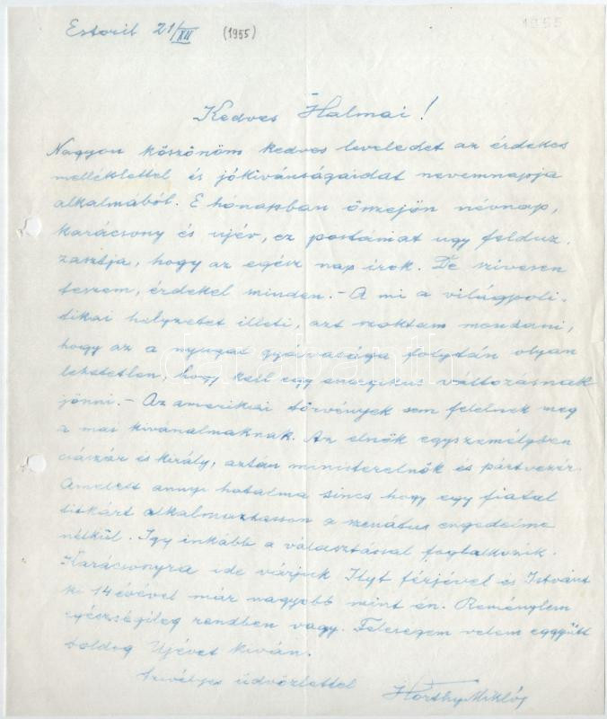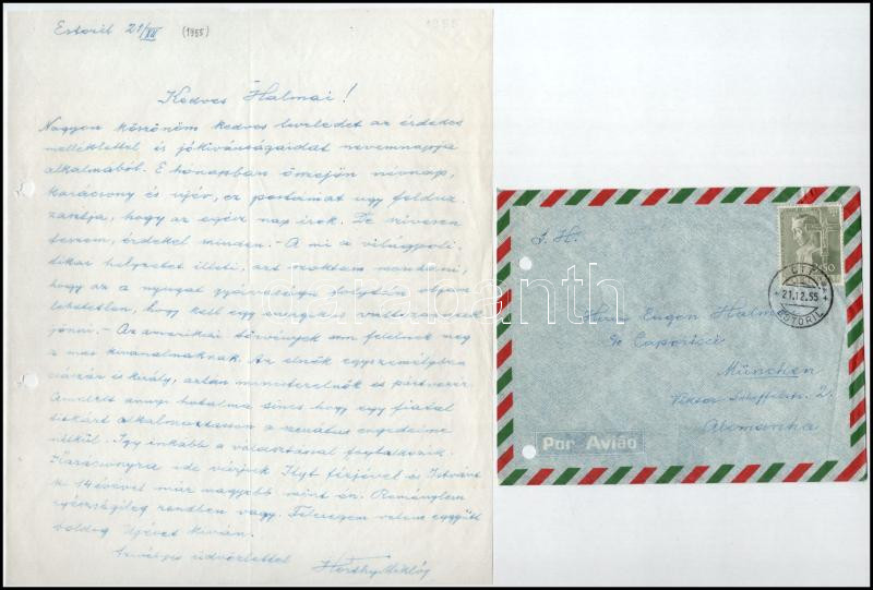 1955 Estoril, 1955. XII. 21., vitéz nagybányai Horthy Miklós (1868-1957) saját kézzel írt levele, aláírásával, Halmai Jenőnek Münchenbe. "...A mi a világpoltikai helyzetet illeti, azt szoktam mondani, hogy az a nyugat gyávasága folytán olyan lehetetlen, hogy kell egy energikus változásnak jönni. - Az amerikai törvények sem felelnek meg a mai kívánalmaknak. Az elnök egyszemélyben császár és király, aztán ministerelnök és pártvezér. Amelett annyi hatalma sincs hogy egy fiatal titkárt alkalmazhasson a szenátus engedelme nélkül. Így inkább a választással foglalkozik. Karácsonyra ide várjuk Ilyt férjével és Istvánt ki 14 évével már nagyobb mint én. ... " Eredeti borítékkal, hajtott, jó állapotban.