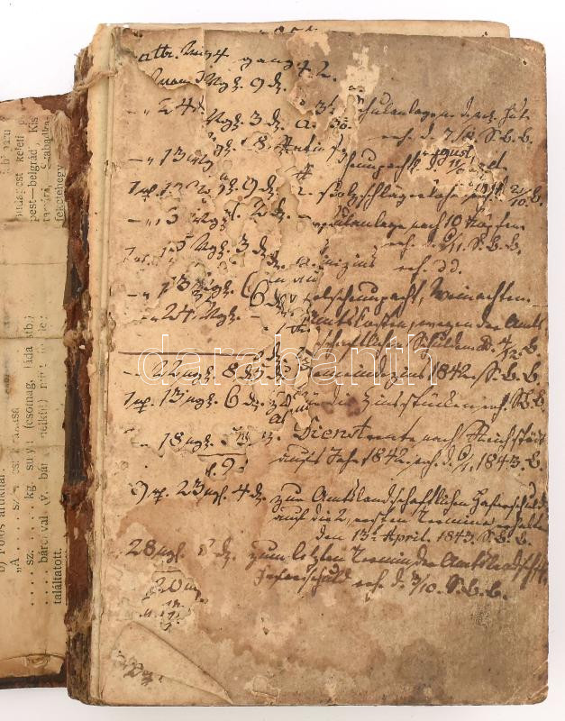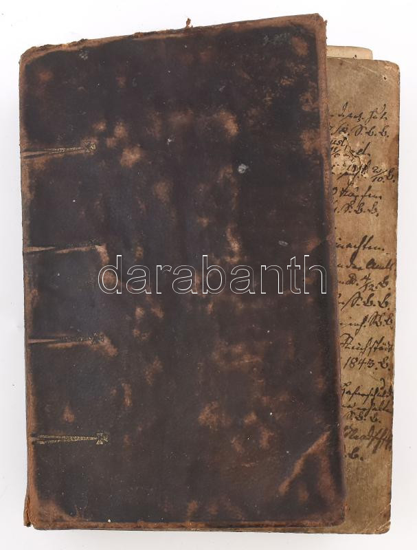 cca 1842-1878 Régi német nyelvű jegyzetkönyv, feltehetÅ‘leg gazdasági bejegyzések, a könyv elején 43 sztl. lev.-en bejegyzések, az azt követÅ‘ 2 lapon firka, a többi része üres. BÅ‘rkötésben, kopott borÃtóval, a könyv teste kijár, a lapok egy része elvált a könyvtesttÅ‘l, az elsÅ‘ két lap sérült, egy lap szélén hiánnyal, a lapokon apró kis lyukakkal.