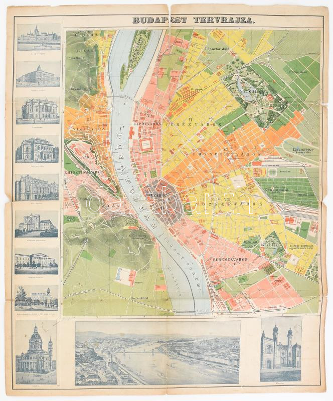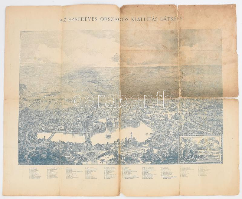 1896 Budapest Székesfőváros Tervrajza, és Útmutatója, a térkép hátoldalán az Ezredéves Országos Kiállítás látképével(Mirkovszky Géza (1855-1899)) Bp., Posner Károly Lajos és Fia, beszakadásokkal, térkép: 44,5x39,5 cm, teljes: 60x49 cm, látkép: 34x52 cm